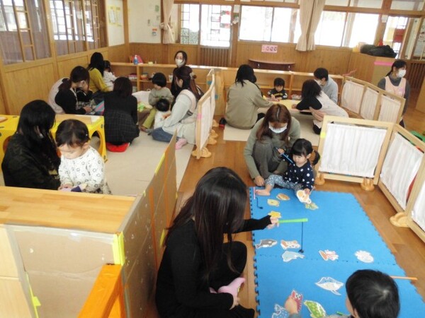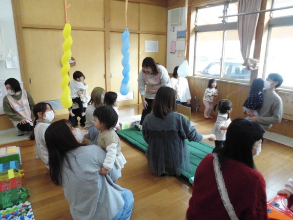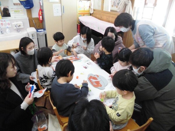| 1月16日(金)に、たんぽぽ組・もも組の保育参観がありました。 たんぽぽ組は、おままごとやマット、釣りなどのコーナー遊びをしました。また、「バスに乗って」のふれあい遊び、子ども達の大好きなベイビーシャークのダンス披露など、保護者の方と楽しい時間を過ごしました。 もも組は、箸遊びや普通の遊びを通して、子ども達の成長の様子を見ていただきました。1月から歌っている「あつあつお鍋」の歌を聴いて頂き、お鍋製作を一緒に楽しみました。白菜・人参・ねぎを塗ったり、買い物ごっこで選んだ魚介をのり付けして、美味しそうなお鍋を保護者の方と一緒に完成させることができました。 どちらのクラスも、子ども達の嬉しそうな笑顔が沢山見られました。お忙しい中、保護者の皆様からご協力頂きましてありがとうございました。 |