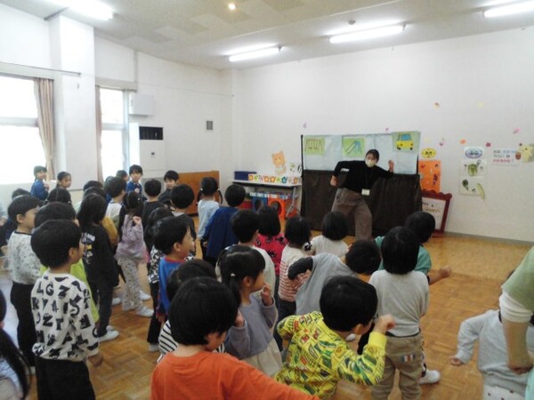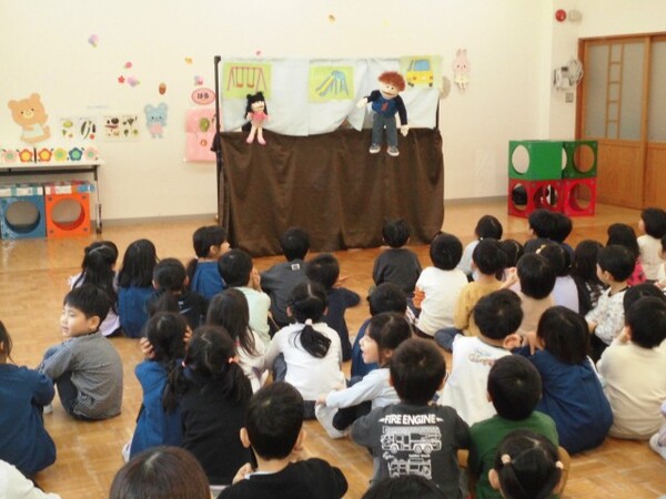 | 11月12日に幼児防犯教室が行われました。紙芝居や人形劇を用いてスーパーや公園では、1人でどこかへ行かず、お家の人と一緒に手をつないでいる事、不審者に会ってしまった時は「たすけてー!!」と大きな声を出して逃げるなどの「いかない」「のらない」「おおごえをだす」「すぐにげる」「しらせる」の合言葉、「いかのおすし」をたくさん教えてもらいました。 最後には「いかのおすし」のダンスを楽しくみんなで踊りました。外出の際は、子どもから目を離すことなく、手をつないで出かけるようよろしくお願いします。 |